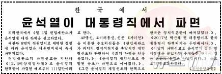(평양 노동신문=뉴스1) = 북한 노동당 기관지 노동신문은 이날 6면에 "괴뢰 한국에서 4월 4일 헌법재판소가 윤석열에 대한 탄핵을 선고했다"며 "재판관 8명의 전원일치로 채택된 결정에 따라 윤석열은 대통령직에서 즉시 파면됐다"라고 보도했다. [국내에서만 사용가능. 재배포 금지. DB 금지. For Use Only in the Republic of Korea. Redistribution Prohibited] rodongphoto@news1.kr