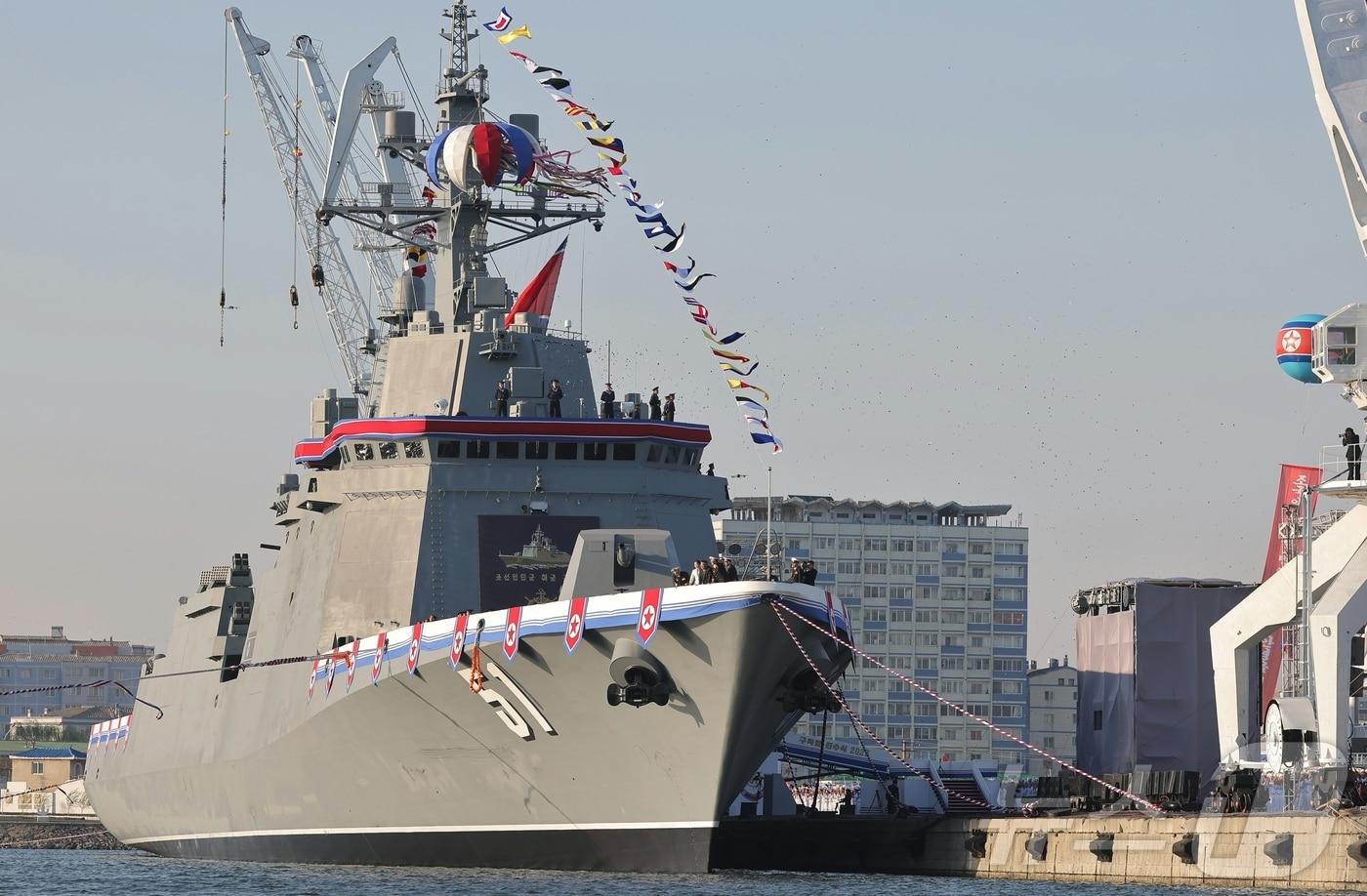 북한 노동당 기관지 노동신문은 26일 "김정은 동지를 모시고 새로 건조한 구축함 진수 기념식이 조선혁명의 첫무장력의 창건일인 뜻깊은 지난 25일 남포조선소에서 성대히 진행됐다"라고 보도했다. 신형 구축함은 5000톤(t)급으로, 북한은 이를 '최현급'으로 등급 분류했다. [국내에서만 사용가능. 재배포 금지. DB 금지. For Use Only in the Republic of Korea. Redistribution Prohibited] rodongphoto@news1.kr