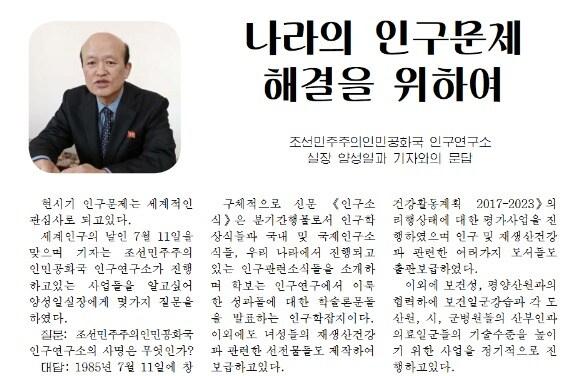 북한 대외 선전용 월간지 금수강산 7월호는 오는 11일 '세계 인구의날'을 맞아 양성일 북한 인구연구소 실장과의 인터뷰를 게재했다. (금수강산 7월호 갈무리)