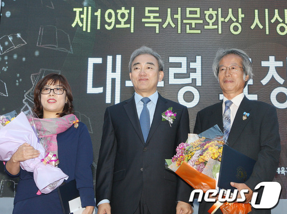 (서울=뉴스1) = 유진룡 문화체육관광부 장관이 25일 오후 서울 서대문구 현저동 서대문구립이진아기념도서관 야외무대에서 열린 제19회 독서문화상 시상식에서 대통령 표창을 수상한 조정옥 시흥지역사회교육협의회 사무국장(왼쪽), 변우열 공주대 문헌정보학과 교수와 기념촬영을 하고 있다.(문화체육관광부 제공) 2013.9.26/뉴스1photo@news1.kr