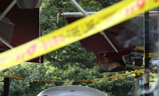 (용인=뉴스1) 김영운 기자 = 14일 오후 경기 용인시 수지고 고기동의 한 카페로 전기차가 돌진하는 사고가 발생해 사고 현장이 통제되고 있다.이 사고로 3명이 중상을, 8명이 경 …