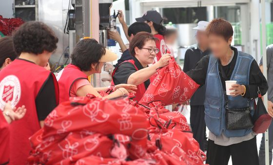 (수원=뉴스1) 김영운 기자 = 추석 연휴를 앞둔 11일 경기 수원시 팔달구 수원역 정나눔터에서 구세군 수원교회 봉사자들이 추석나눔 선물을 노숙인들과 독거 어르신들께 전달하고 있다. 2024.9.11/뉴스1