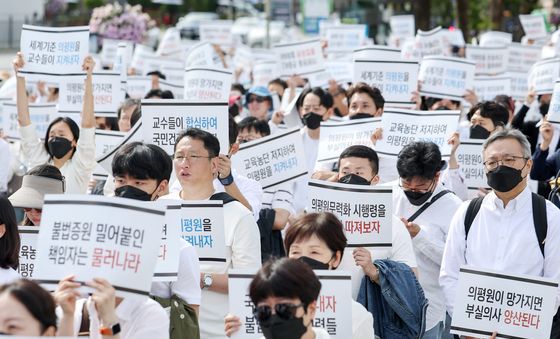 (서울=뉴스1) 민경석 기자 = 전국 의과대학 교수들과 학생들이 3일 오후 서울 용산구 대통령실 앞에서 '의학교육평가원 무력화 저지를 위한 전국의과대학 교수 결의대회'를 하고 있다.