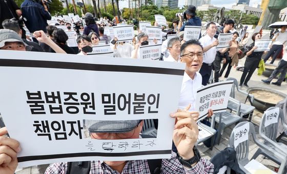 이날 참가자들은 의대 증원으로 의과대학 교육 여건이 나빠져 의평원의 인증 평가에서 불인증을 받더라도 처분을 1년 이상 유예하는 내용을 담은 정부의 '고등교육기관의 평가·인증 등에 관한 규정' 개정안 입법예고를 즉각 철회하라고 촉구 했다. 2024.10.3/뉴스1
