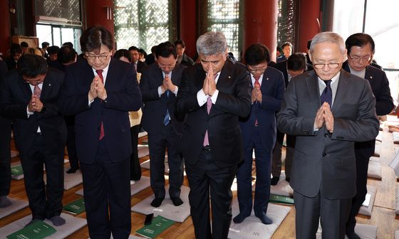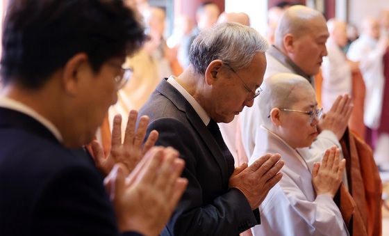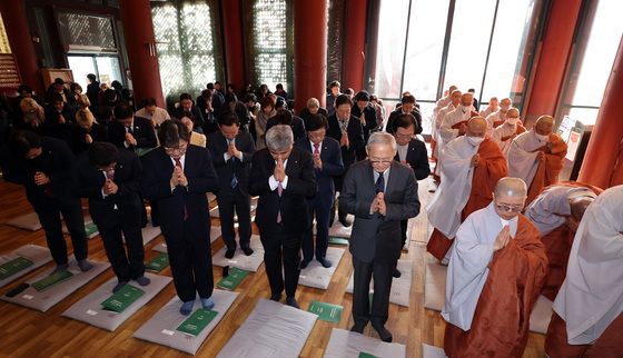 (서울=뉴스1) 이동해 기자 = 유인촌 문화체육관광부 장관과 권성동 국민의힘 원내대표 등 참석자들이 21일 오후 서울 종로구 조계사 대웅전에서 열린 한국불교지도자 신년하례법회에서 책자를 살펴보고 있다. 2025.1.21/뉴스1eastsea@news1.kr관련 키워드한국불교지도자신년하례법회조계사관련 사진합장하는 유인촌 장관'한국불교지도자 신년 하례법회'한국불교지도자 신년 하례법회