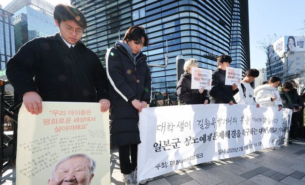 (서울=뉴스1) 허경 기자 = 평화나비네트워크 대학생들이 19일 서울 종로구 일본대사관 앞에서 긴급기자회견을 열고 "대학생이 길원옥 할머니의 뜻을 이어가겠습니다." 故길원옥 할머니를 애도하는 묵념을 하고 있다. 2025.2.19/뉴스1neohk@news1.kr관련 키워드대학생이 길원옥할머니의 뜻을 이어가겠습니다: 일본군 성노예제 문제해결을 촉구하는 대학생 긴급기자회견관련 사진"대학생이 길원옥 할머니의 뜻을 이어가겠습니다."'정부는 일본군 위안부 문제 해결하라'일본군 성노예제 문제해결 촉구하는 대학생들허경 기자 NHK 인터뷰하는 이재명 대통령NHK 인터뷰하는 이재명 대통령이재명 대통령, 방일 직전 NHK 인터뷰