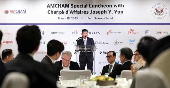 (서울=뉴스1) 박지혜 기자 = 조셉 윤 주한미국대사 대리가 18일 서울 종로구 포시즌스호텔에서 열린 암참 초청 특별 간담회에 인사말을 하고 있다. 2025.3.18/뉴스1pjh2580@news1.kr관련 키워드암참조셉윤주한미국대사대리주한미국상공회의소관련 사진암참 세미나서 연설하는 김민석 총리인사말 하는 제임스 김 암참 회장인사말 하는 제임스 김 암참 회장박지혜 기자 발제하는 송보근 대한전공의협의회 수련이사머리 맞댄 복지부와 전공의전공의 만난 복지부