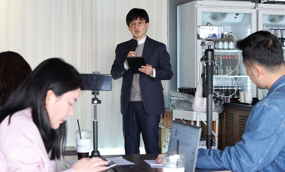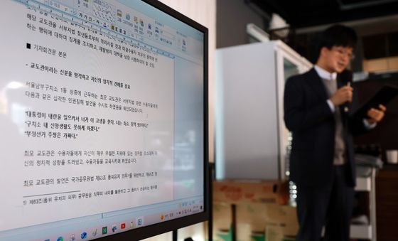 (서울=뉴스1) 김진환 기자 = '서부지법 난동 사태' 가담자 측 권우현 변호사가 24일 오후 서울 마포구 어거스트21에서 기자회견을 하고 있다.이날 변호인단은 난동 사태 가담자들 …