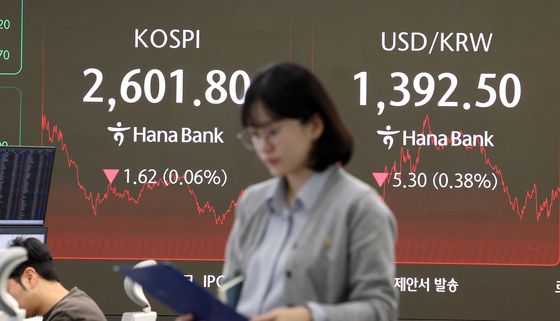 (서울=뉴스1) 안은나 기자 = 코스피가 5% 넘게 하락하고 환율은 5년 만에 최대치로 폭등한 7일 오후 서울 여의도 KB국민은행 스마트딜링룸에 관련 화면이 나오고 있다.