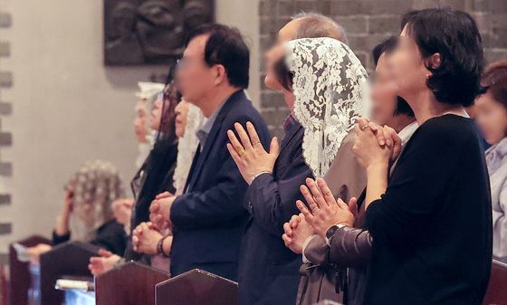 (서울=뉴스1) 김성진 기자 = 제266대 교황인 프란치스코 교황이 선종한 21일 서울 중구 천주교 서울대교구 주교좌명동대성당에서 신도들이 평일 미사를 하고 있다.