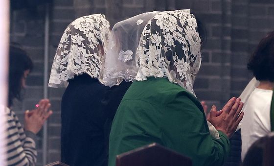 (서울=뉴스1) 김성진 기자 = 제266대 교황인 프란치스코 교황이 선종한 21일 서울 중구 천주교 서울대교구 주교좌명동대성당에서 신도들이 평일 미사를 하고 있다.