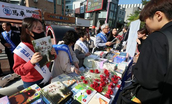 출협은 이날 행사에서 인문, 문학, 역사 분야 도서 약 500부와 장미꽃을 시민들에게 증정했다. 2025.4.23/뉴스1