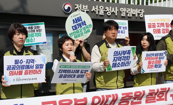 (서울=뉴스1) 임세영 기자 = 민주노총 전국보건의료산업노동조합 관계자들이 24일 오전 서울 종로구 정부서울청사 앞에서 올바른 의료개혁 추진 요구를 위한 기자회견을 갖고 국민 동의 없는 교육부 의대 증원 철회를 규탄하고 있다. 2025.4.24/뉴스1seiyu@news1.kr관련 키워드보건의료노조의사집단행동의대증원관련 사진보건의료노조, 올바른 의료개혁 추진을 위한 기자회견'올바른 의료개혁 추진을 위한 기자회견''의대증원이 해답이다'임세영 기자 '내란 우두머리' 혐의 1심 결심 공판 출석한 윤석열윤석열·김용현, '내란 우두머리' 재판 1심 결심공판 출석'내란 우두머리' 재판 1심 결심공판 출석한 윤석열·김용현