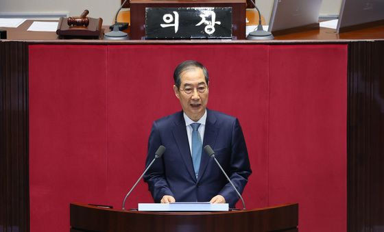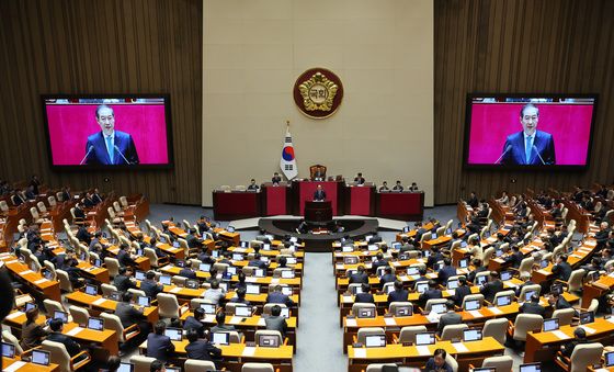 (서울=뉴스1) 이재명 기자 = 24일 서울 여의도 국회 본회의장에서 한덕수 대통령 권한대행 국무총리의 2025년도 제1회 추가경정예산안에 대한 정부의 시정연설 이후 우원식 국회의장의 "대정부 질문의 국회 출석 답변과 상설특검 추천 의뢰 등 해야 할 일과 헌법재판관 지명 등 하지 말아야 할 일을 잘 구별하기를 바란다" 발언에 국민의힘 권성동 원내대표가 항의를 하자 여야 원내지도부가 의장석 앞으로 모여있다. (공동취재) 2025.4.24/뉴스1