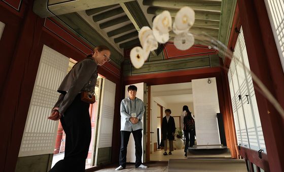 (서울=뉴스1) 이동해 기자 = 28일 서울 종로구 창경궁에서 관광객들이 국가무형유산 보유자 및 이수자, 현대 공예작가들이 참여한 전통공예 융합 전시 '고궁만정' 작품을 살펴보고 있다.