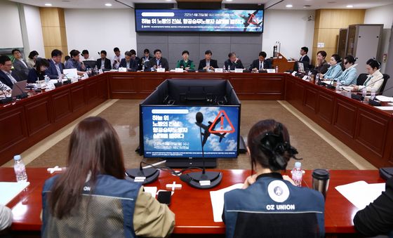 (서울=뉴스1) 김민지 기자 = 이현진 대한항공직원연대지부 노동안전보건부장(왼쪽 두번째)이 28일 서울 여의도 국회 의원회관에서 열린 항공승무노동자 노동실태 국회토론회에서 발언하고 있다. 2025.4.28/뉴스1kimkim@news1.kr관련 키워드국회항공승무원노동실태관련 사진국회 온 항공승무노동자들'항공승무노동자 노동실태 국회토론회'항공승무원 노동실태 말하는 이현진 노동안전보건부장김민지 기자 공격하는 얀니크 신네르득점 기회 잡은 알카라스땀 닦는 얀니크 신네르