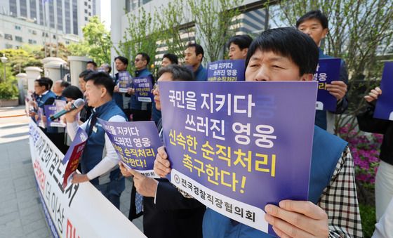 전국경찰직장협의회는 이날 기자회견을 열고 "최근 3년간 순직 처리된 인원은 32명, 불승인 인원은 11명"이라며 "불승인 확률은 34.37%로, 3명 중 1명은 순직을 거부당하고 있는 상황"이라고 밝혔다. 2025.4.29/뉴스1