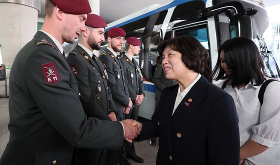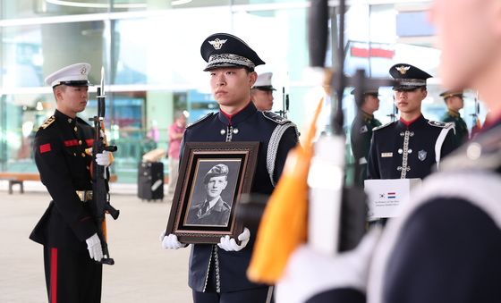 (인천공항=뉴스1) 김성진 기자 = 강정애 국가보훈부 장관이 29일 인천국제공항 제2여객터미널에서 거행된 네덜란드 참전용사 요하네스 홀스트만 유해 봉환식에서 예를 표하고 있다.