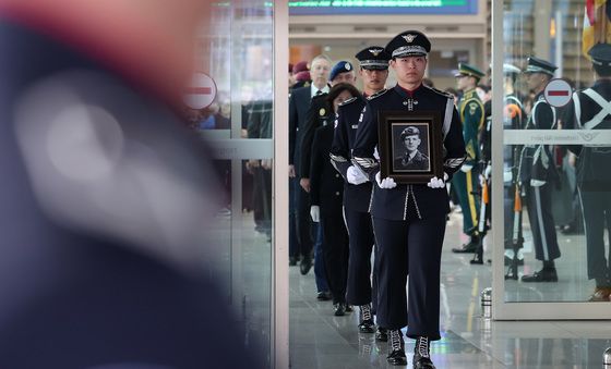 (인천공항=뉴스1) 김성진 기자 = 강정애 국가보훈부 장관이 29일 인천국제공항 제2여객터미널에서 거행된 네덜란드 참전용사 요하네스 호르스트만 유해 봉환식에서 반호이츠 부대에서 복무중인 부대원과 인사하고 있다.