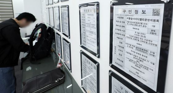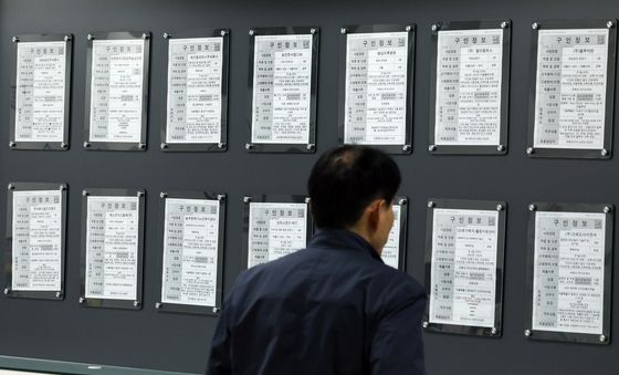 (서울=뉴스1) 박정호 기자 = 30일 오후 서울 영등포구 국회대로 영등포아트홀에서 열린 2025 희망‧행복·미래 취업박람회를 찾은 구직자들이 채용게시대를 살펴보고 있다.이번 취업 …