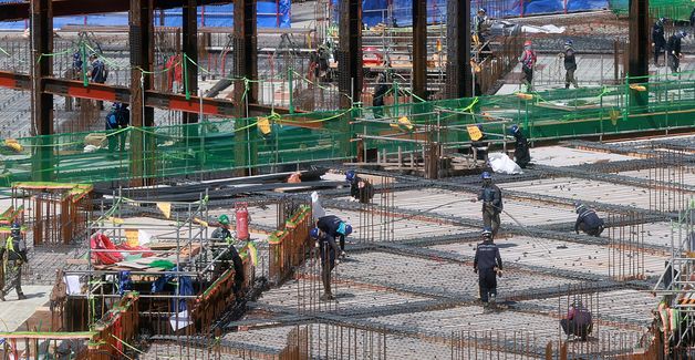 (서울=뉴스1) 김진환 기자 = 근로자의 날을 하루 앞둔 30일 서울 시내 신축 아파트 시공 현장에서 건설노동자들이 작업을 하고 있다.