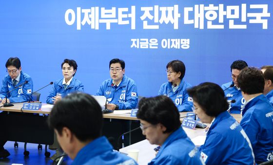 (서울=뉴스1) 김민지 기자 = 30일 서울 여의도 국회 의원회관에서 열린 '더불어민주당 제21대 대통령선거 중앙선거대책위원회 출범식'에서 상임 총괄선대위원장을 맡은 윤여준 전 환경부 장관(왼쪽부터)과 박찬대 당대표 직무대행 겸 원내대표, 총괄선대위원장을 맡은 강금실 전 법무부 장관, 정은경 전 질병관리청장, 김부겸 전 총리, 김경수 전 경남지사, 김동명 한국노총위원장, 공동선대위원장을 맡은 이석연 전 법제처장이 각오를 밝히고 있다. 2025.4.30/뉴스1