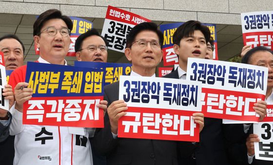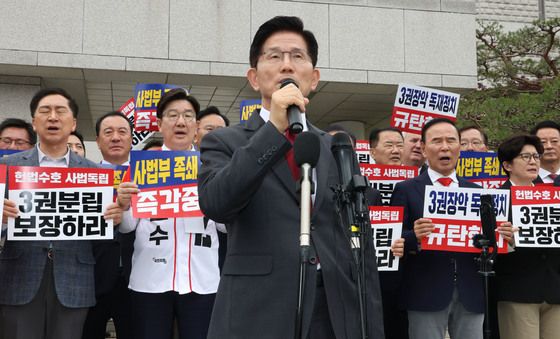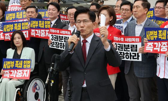 (서울=뉴스1) 신웅수 기자 = 더불어민주당 의원들이 2일 오후 서울 서초구 대법원을 찾아 이재명 더불어민주당 대통령 후보 공직선거법 위반 혐의 사건 상고심 파기 환송 규탄 기자회견을 하고 있다.