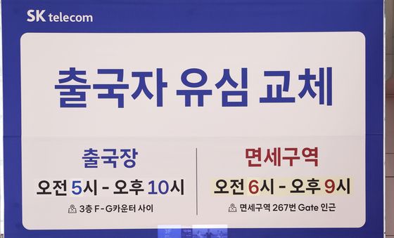 (인천공항=뉴스1) 황기선 기자 = 5일 인천국제공항 제2여객터미널 출국장에 마련된 SK텔레콤(SKT) 로밍센터에서 여행객들이 유심 교체 서비스를 받기 위해 대기하고 있다.SKT는 …