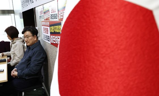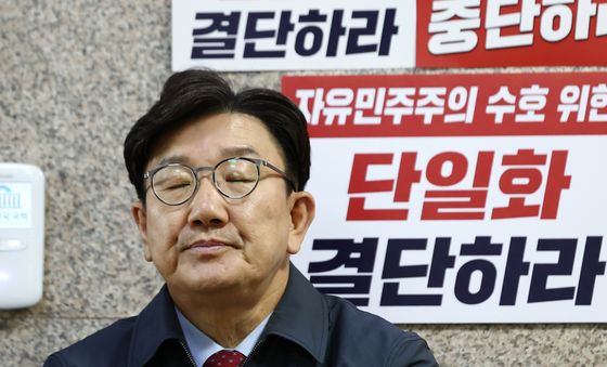 (서울=뉴스1) 김민지 기자 = 김문수 국민의힘 대통령 후보에게 단일화 약속을 촉구하며 무기한 단식에 돌입한 권성동 원내대표가 8일 오전 서울 여의도 중앙당사에서 같은 이유로 단식 …