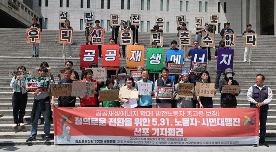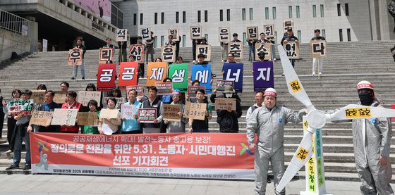 (서울=뉴스1) 임세영 기자 = 정의로운전환 2025 공동행동 관계자들이 8일 오전 서울 종로구 세종문화회관 앞에서 앞에서 정의로운 전환을 위한 5.31 노동자·시민대행진 선포 기자회견을 하고 있다. 2025.5.8/뉴스1seiyu@news1.kr관련 키워드석탄재생에너지발전노동자고용보장관련 사진'공공재생에너지 확재, 발전노동자 총고용 보장하라''발전 노동자 고용 보장하라'정의로운 전환을 위한 5.31 노동자·시민대행진 선포 기자회견임세영 기자 김진향 의장, 남북경협 기관·단체, '남북관계 신뢰회복-평화복원' 기자회견통일부 기자실 찾은 남북경협기관·단체장남북경협 기관·단체, '남북관계 신뢰회복-평화복원' 기자회견