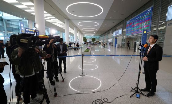(인천공항=뉴스1) 박세연 기자 = 체코 방문을 마친 안덕근 산업통상자원부 장관이 8일 오후 인천국제공항을 통해 귀국해 취재진 질문에 답하고 있다.