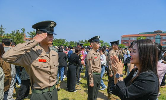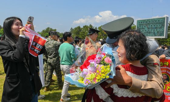 (포항=뉴스1) 최창호 기자 = 해병대교육훈련단 장병이 8일 경북 포항시 남구에 있는 연병장에서 열린 신병 1361기(1365명)에 대한 수료식에서 어머니와 인사를 나누고 있다.