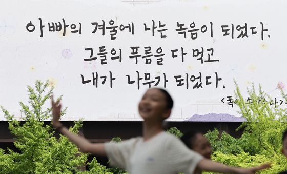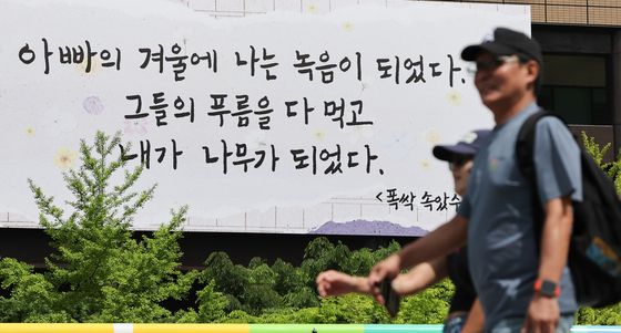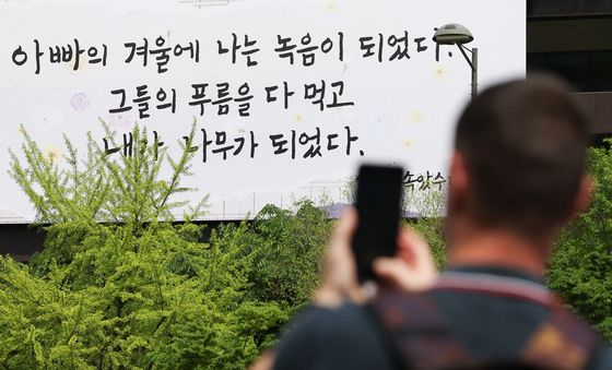 (서울=뉴스1) 허경 기자 = 8일 서울 종로구 교보생명빌딩 외벽 광화문글판에 넷플릭스 시리즈 ‘폭싹 속았수다’의 내레이션인 '아빠의 겨울에 나는 녹음이 되었다. 그들의 푸름을 다 …
