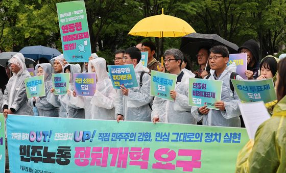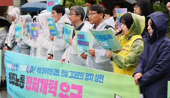(서울=뉴스1) 임세영 기자 = 민주노총 정치위원회 관계자들이 9일 오전 서울 광화문광장에서 정치개혁 요구 기자회견을 하고 있다. 2025.5.9/뉴스1seiyu@news1.kr관련 키워드민주노총정치개혁관련 사진'정치개혁 요구하는 민주노총'민주노총 정치개혁 요구 기자회견민주노총 정치개혁 요구 기자회견임세영 기자 김진향 의장, 남북경협 기관·단체, '남북관계 신뢰회복-평화복원' 기자회견통일부 기자실 찾은 남북경협기관·단체장남북경협 기관·단체, '남북관계 신뢰회복-평화복원' 기자회견