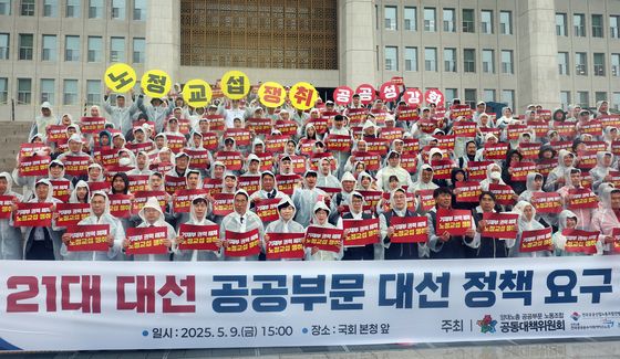 (서울=뉴스1) 황기선 기자 = 민주노총과 한국노총 조합원들이 9일 오후 서울 영등포구 여의도 국회 본청 앞에서 21대 대선 공공부문 대선정책 요구 발표 기자회견을 하고 있다. 2025.5.9/뉴스1