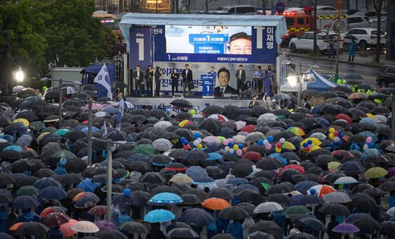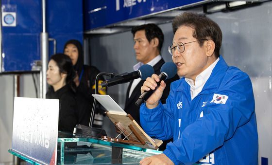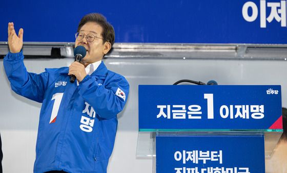 (성주=뉴스1) 이재명 기자 = 3차 경청투어에 나선 이재명 더불어민주당 대통령 후보가 9일 오후 경북 성주군 성주전통시장에서 시민들에게 인사하고 있다. 2025.5.9/뉴스1