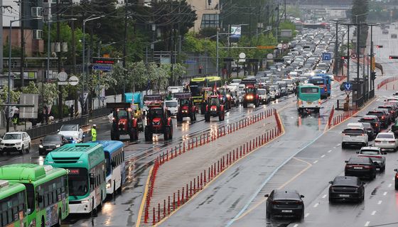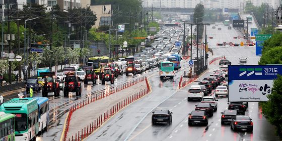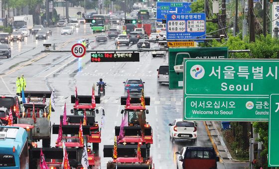 (서울=뉴스1) 장수영 기자 = 전국농민회총연맹 산하 전봉준투쟁단 트랙터가 10일 오후 서울 금천구 석수역 앞 시흥대로를 지나고 있다.