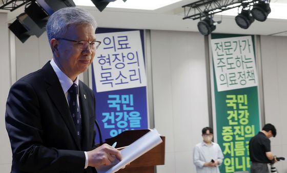 (서울=뉴스1) 이동해 기자 = 김택우 대한의사협회 회장이 3일 오후 서울 용산구 대한의사협회회관에서 정례브리핑을 하고 있다. 2025.7.3/뉴스1eastsea@news1.kr관련 키워드의사협회정례브리핑관련 사진정례브리핑 위해 이동하는 김택우 의협회장김택우 대한의사협회 회장 정례브리핑정례브리핑하는 김택우 대한의사협회 회장