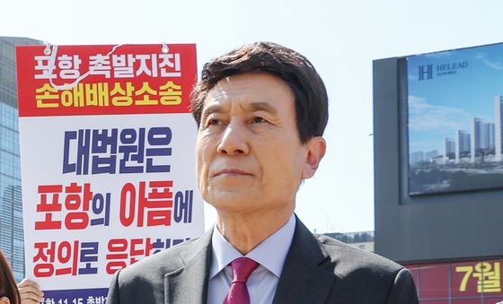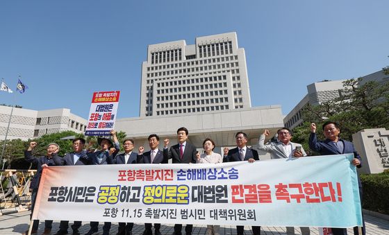 (포항=뉴스1) 최창호 기자 = 법무법인 서울센트럴 이경우 대표 변호사(왼쪽)과 법무법인 인월 박무상 변호사가 7일 경북 포항시청 브리핑룸에서 포항지진정신적손해배상 항소심 후행 재판에 대한 기자회견을 하고 있다.