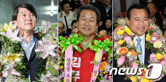 4·24 재·보궐선거 개표결과 서울 노원병 무소속 안철수 후보(왼쪽부터),부산 영도 새누리당 김무성 후보,충남 부여·청양 새누리당 이완구 후보가 각각 압도적 우세를 보이면서 당선이 확실시되자 꽃다발을 목에 걸고 기뻐하고 있다. 2013.4.24/뉴스1 © News1 유승관 오대일 전혜원 기자