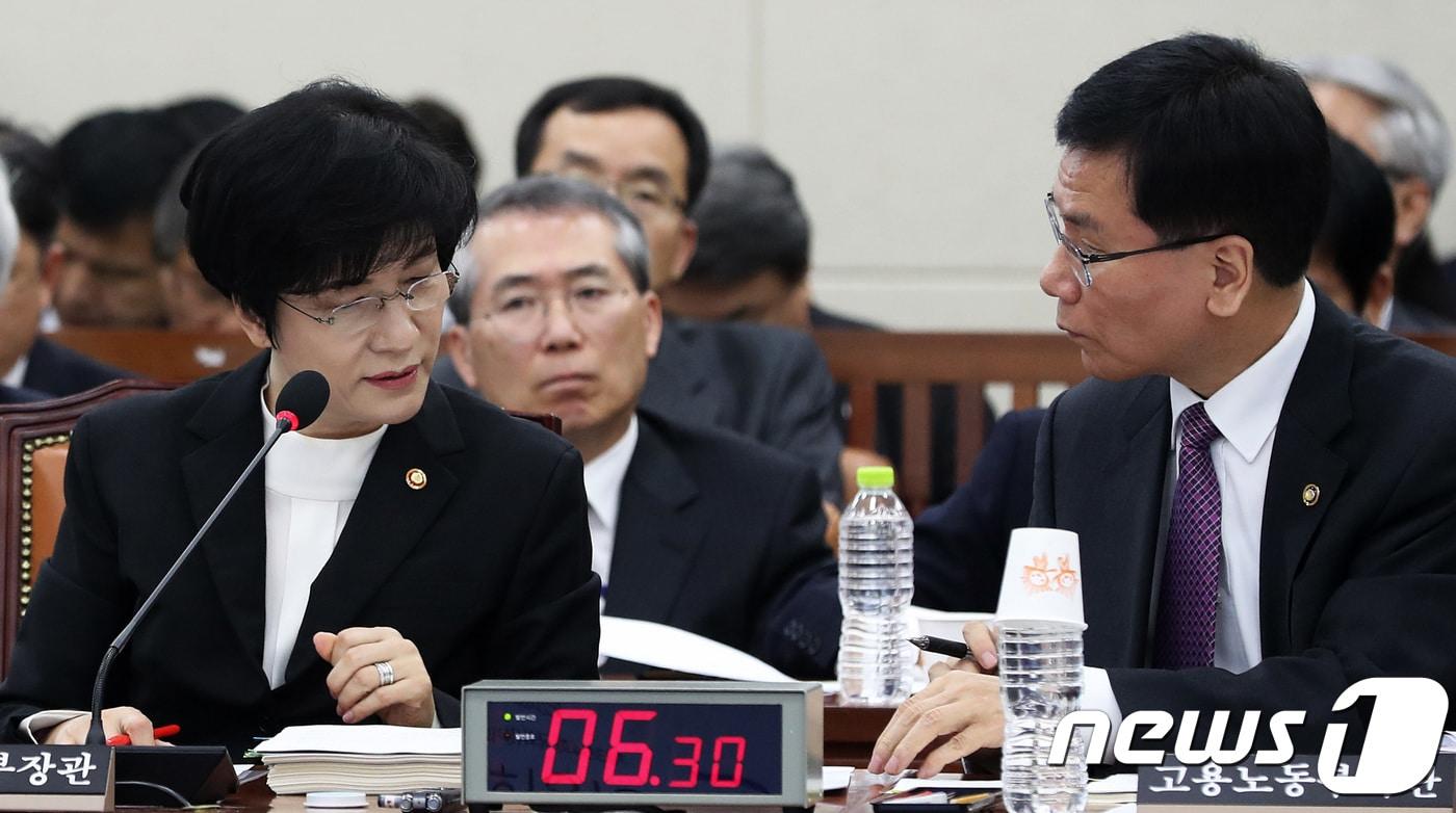김영주 고용노동부 장관(왼쪽)과 이성기 차관이 31일 서울 여의도 국회에서 열린 환경노동위원회의 고용노동부 종합감사에서 머리를 맞댄 채 대화를 나누고 있다. 2017.10.31/뉴스1 ⓒ News1 오대일 기자
