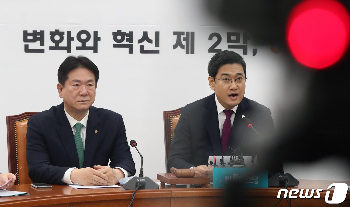 중앙당 윤리위원회로부터 '당원권 1년 정지'라는 중징계를 받은 오신환 바른미래당 원내대표가 3일 오전 서울 여의도 국회에서 열린 원내대책회의에서 모두발언을 하고 있다. 왼쪽은 이날 원내대표 권한대행으로 임명된 와 이동섭 의원. 손학규 바른미래당 대표는 이날 문희상 국회의장, 유인태 국회사무총장을 비롯해 여야 각당 원내대표들에게 오신환 원내대표의 직위가 박탈됐다는 공문을 보낸 것으로 알려졌다. 공문에 따르면 당규 24조에 의해 원내대표 권한대행은 원내수석부대표인 이동섭 의원이 임명 된 것으로 전해졌다. 2019.12.2/뉴스1 ⓒ News1 민경석 기자