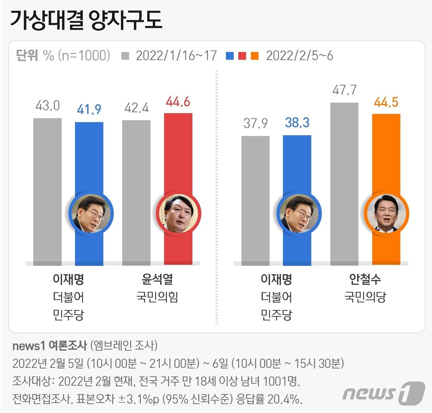 뉴스1-엠브레인퍼블릭 여론조사…직전 조사 대비 尹 42.4%→44.6% 상승, 安 47.7%→44.5% 하락尹, 60대 이상·TK·보수층에서 安보다 경쟁력…安, 중도 및 진보층·30대·호남서 尹에 우위ⓒ News1 최수아 디자이너관련 키워드뉴스1대선여론조사2022대선여론조사2022대선여론돌려보기대선레이스관련 기사보수진영 경기지사 후보…유승민 20% 김은혜 16% '없다' 47%尹 넘어선 'V0' 김건희 의혹 밝혀낸 특검…편파수사 논란에 빛 바래'수사종료' 김건희특검, 尹부부 등 76명 기소…"金, 현대판 매관매직"[지방선거 누가 뛰나]청주시장 여야 주자들 공식 부상…현직 등판 주목'24시간 필버' 기세 탄 장동혁…집 나간 '집토끼' 보수 재건 '화두'