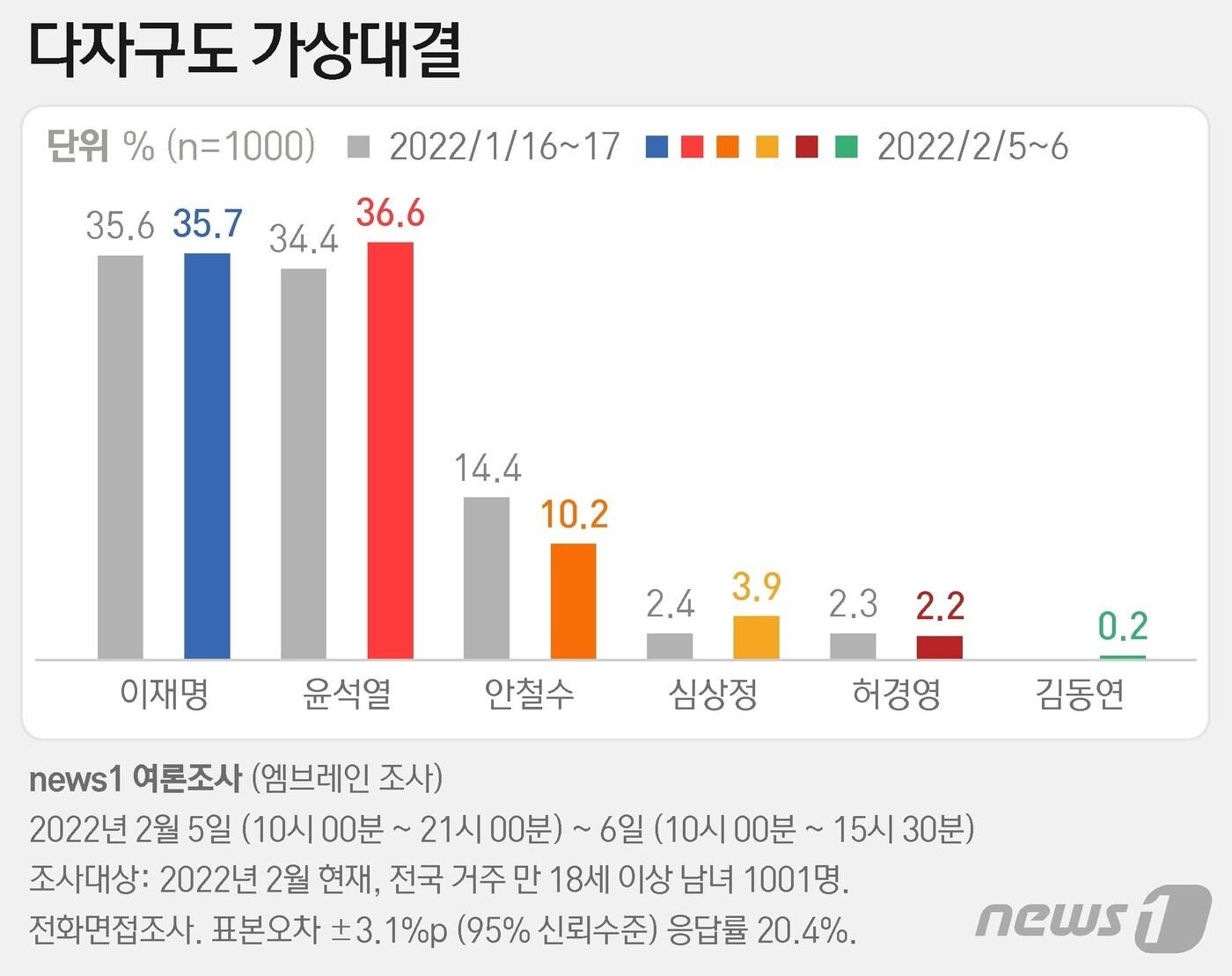 뉴스1-엠브레인퍼블릭 여론조사…尹 소폭 상승, 李 정체, 安 하락당선가능성도 오차범위 내 역전…尹 46.5% 李 41.1%ⓒ News1 최수아 디자이너ⓒ News1 최수아 디자이너관련 키워드2022대선뉴스1대선여론조사2022대선여론조사여론돌려보기대선레이스정재민 기자 [속보] 김용현 "거대야당 패악질이 국헌문란…尹, 경종 위해 비상계엄 선포"[속보] '무기징역 구형' 김용현 최후진술 "합법적 계엄, 내란으로 몰아가"관련 기사보수진영 경기지사 후보…유승민 20% 김은혜 16% '없다' 47%尹 넘어선 'V0' 김건희 의혹 밝혀낸 특검…편파수사 논란에 빛 바래'수사종료' 김건희특검, 尹부부 등 76명 기소…"金, 현대판 매관매직"[지방선거 누가 뛰나]청주시장 여야 주자들 공식 부상…현직 등판 주목'24시간 필버' 기세 탄 장동혁…집 나간 '집토끼' 보수 재건 '화두'