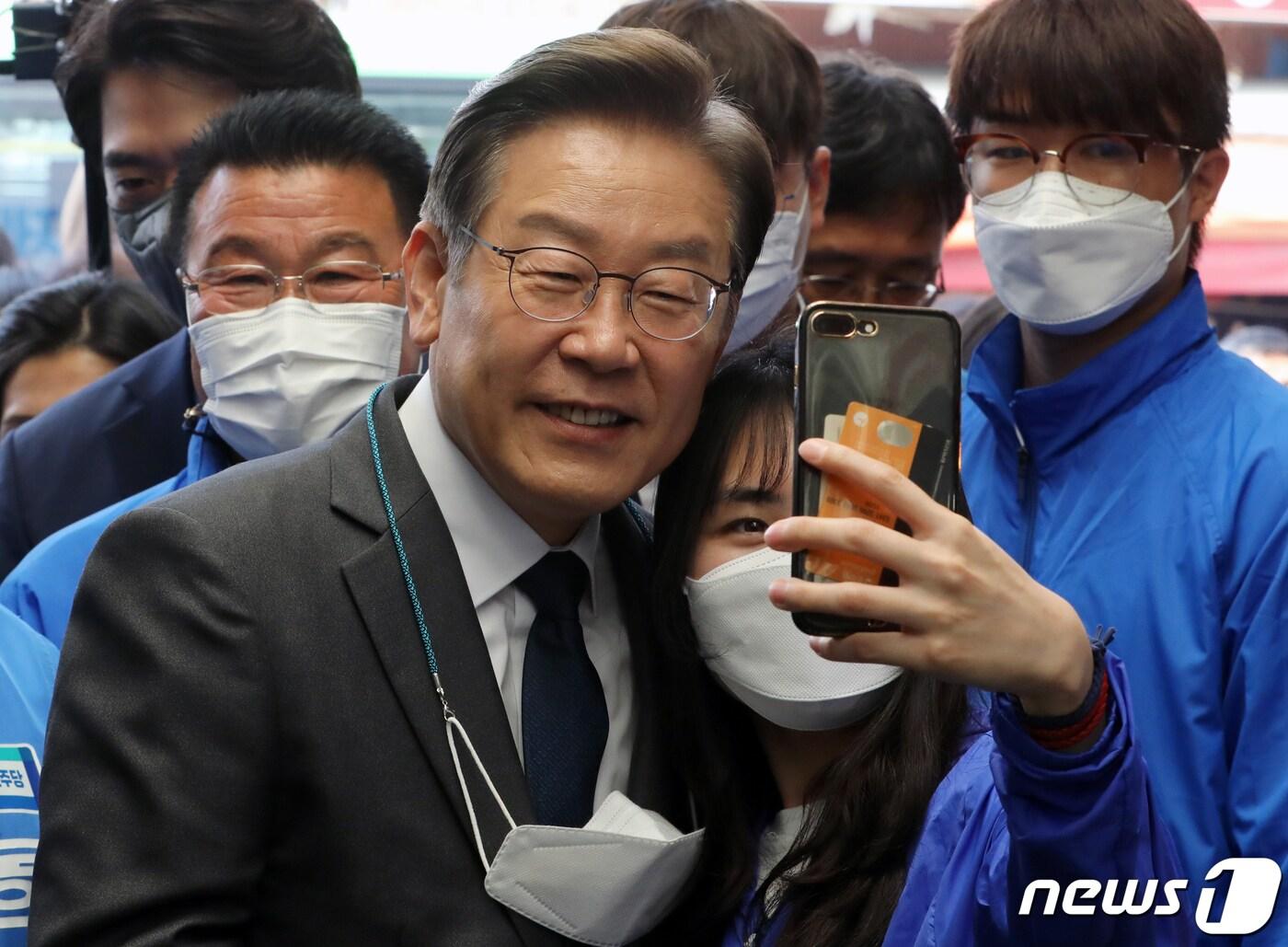 리얼미터 여론조사…당선예측 이재명 55.3%, 윤형선 35.8%정권 견제론 45.5% vs 정권 안정론 43.5%…오차범위 내 팽팽인천 계양을 국회의원 보궐선거에 출마한 더불어민주당 이재명 총괄선대위원장이 18일 인천시 동구 현대시장에서 한 지지자와 사진을 촬영하고 있다. 2022.5.18/뉴스1 ⓒ News1 정진욱 기자관련 키워드2022지방선거2022지선재보선2022지선여론조사