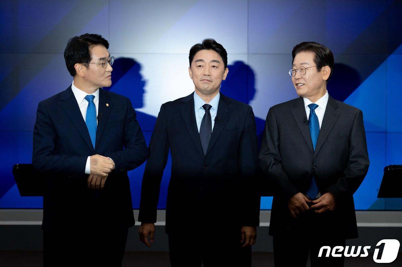 더불어민주당 박용진(왼쪽부터), 강훈식, 이재명 당대표 후보가 2일 오후 강원도 춘천시 G1 강원민방에서 열린 민주당 당대표 후보자 토론회에 앞서 기념 촬영을 마친 후 대화하고 있다. 2022.8.2/뉴스1 ⓒ News1 이재명 기자