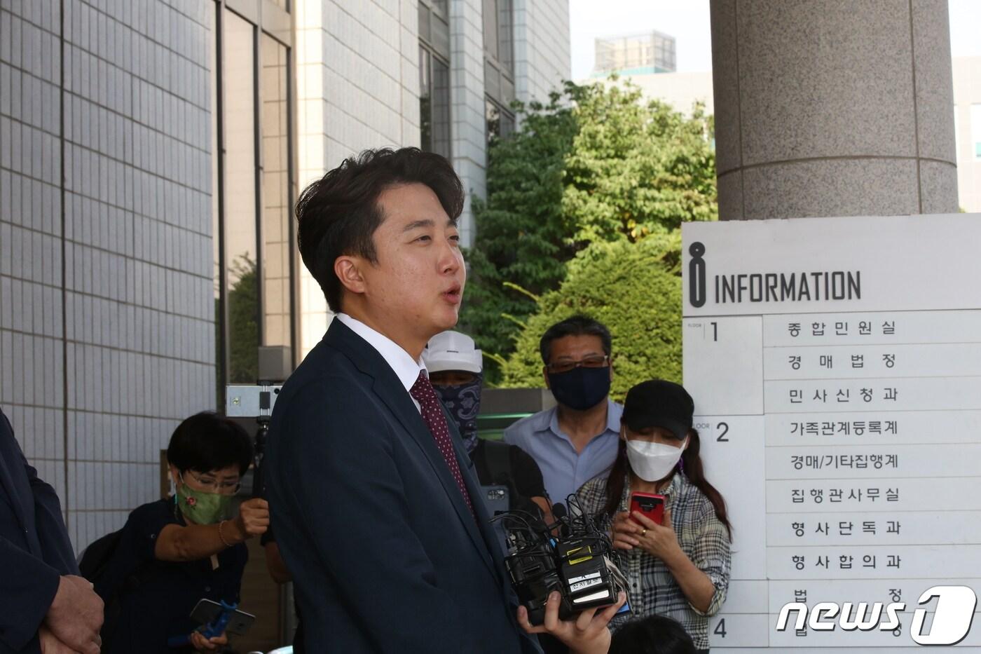 이준석 전 국민의힘 대표가 17일 서울 양천구 남부지방법원에서 당 비상대책위원회 효력을 정지해달라며 낸 가처분 신청 사건 심문을 마친 후 취재진 질문에 답변하고 있다. 2022.8.17/뉴스1 ⓒ News1 국회사진취재단