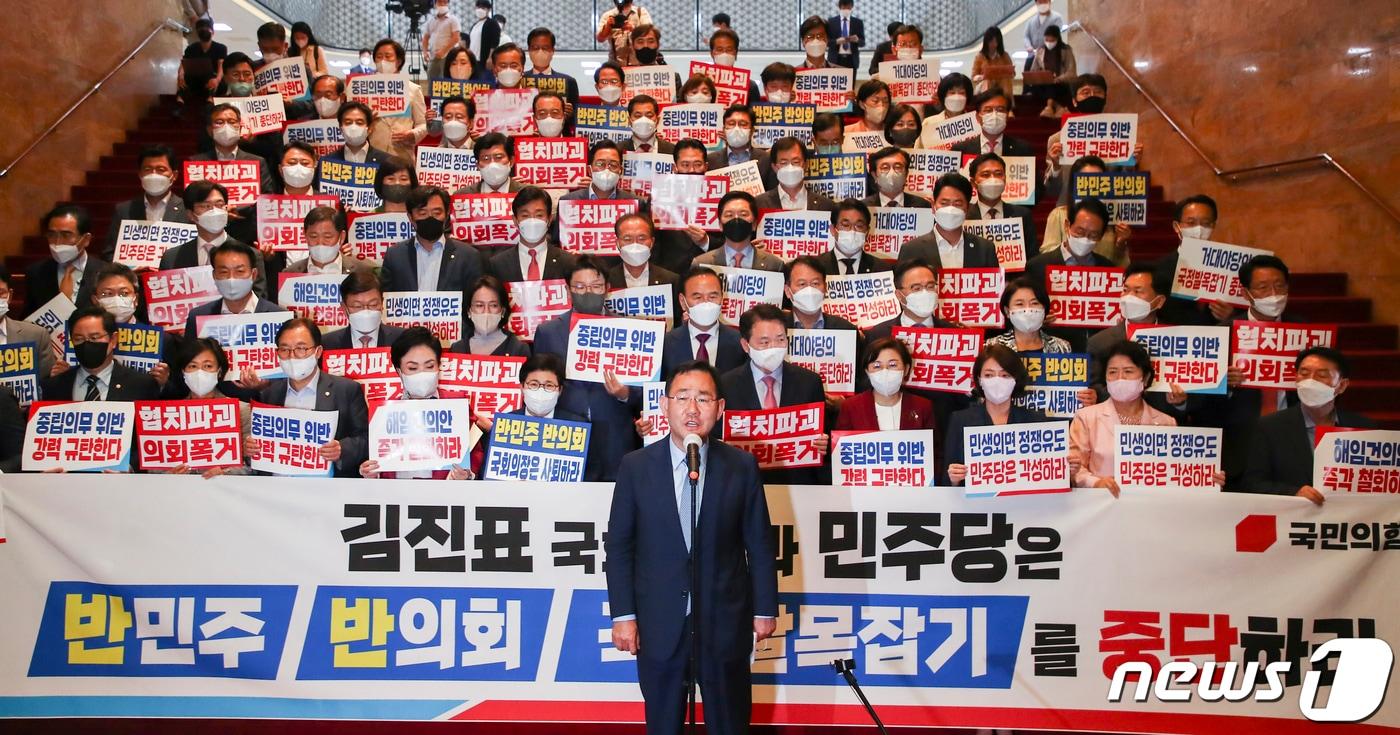 박진 외교부 장관 해임건의안이 더불어민주당 단독 처리로 국회를 통과한 29일 오후 서울 여의도 국회 로텐더홀 계단에서 주호영 국민의힘 원내대표와 의원들이 피켓 시위를 하며 구호를 외치고 있다. (공동취재) ⓒ News1 이재명 기자박태훈 선임기자 신동욱, 마지막 해법이라며 한동훈에 '최고위 공개검증' 제안천하람 "이혜훈 도덕성마저 처참, 2016년엔 '동료 의원 낙선 기도' 요청까지"