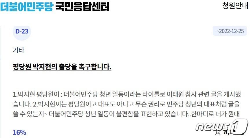 더불어민주당 당원 청원 장소인 '국민응답센터'에 올라 와 있는 박지현 전 공동비대위원장 '출당' 요구 청원. 2일 오전 4시 현재 8113명이 동의했다. 청원기간(30일)동안 동의 당원수가 5만명이 넘을 경우 민주당 차원에서 답을 하고 있다. (민주당 홈페이지 갈무리) 박태훈 선임기자 천하람 "靑고위층 '이혜훈 더 나올 게 있냐' 묻더라…터트릴 것 있다"권영세 "韓 잘했다는 건 아니지만 제명은 과해…韓도 비난만 말고 협조·소명을"