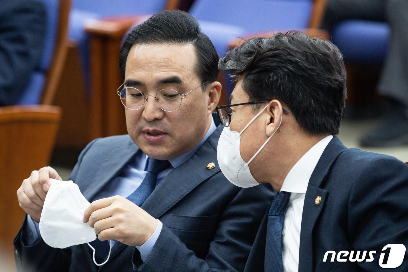 박홍근 더불어민주당 원내대표(왼쪽)와 진성준 원내수석부대표가 2일 서울 여의도 국회에서 열린 의원총회에서 대화를 나누고 있다. 2022.12.2/뉴스1 ⓒ News1 유승관 기자